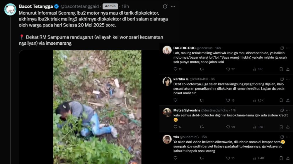 dilansir dari unggahan akun x (sebelumnya twitter) @bacottetanggaid pada rabu (21/5/2025), debt collector kena keroyok massa setelah teriakan maling menggema dari sang ibu-ibu.
