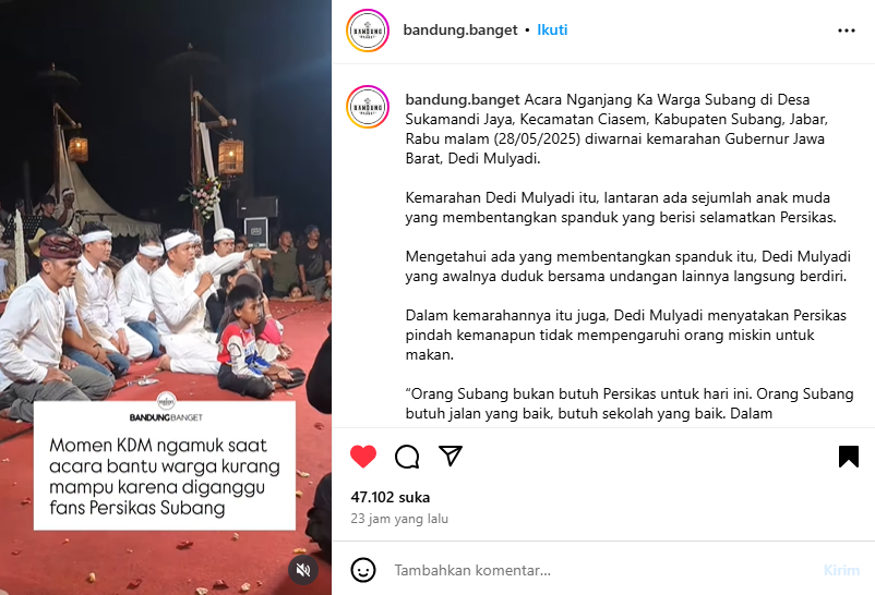 Acara yang seharusnya menjadi momen silaturahmi antara Gubernur Jawa Barat Dedi Mulyadi dengan masyarakat setempat mendadak memanas akibat aksi puluhan suporter Persikas Subang.