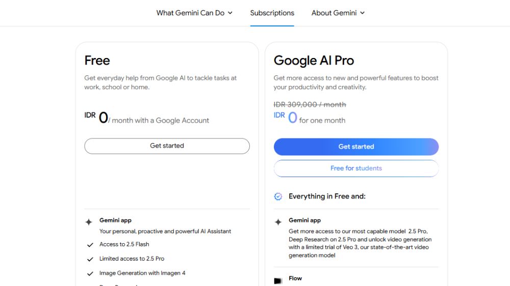 - Google AI Pro: Sekitar $20 USD/bulan atau setara Rp300.000, dengan akses ke Flow dan 100 kreasi video per bulan.