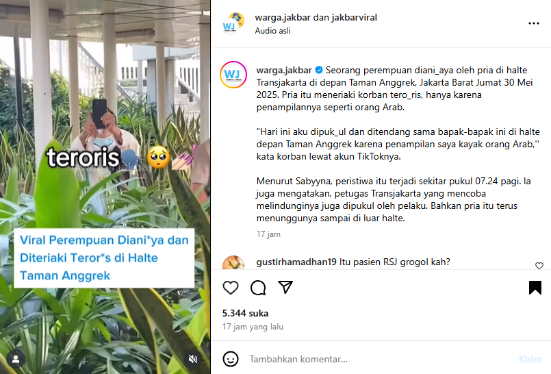 "Hari ini aku dipukul dan ditendang sama bapak-bapak ini di halte depan Taman Anggrek karena penampilan saya kayak orang Arab," ungkap korban dalam video TikTok-nya yang telah ditonton ratusan ribu kali.