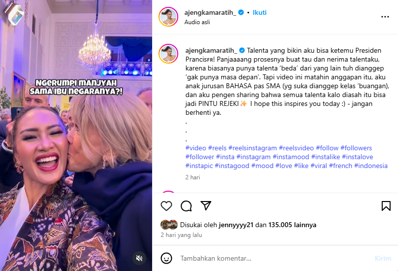 “seluruh talenta yang terus diasah bisa menjadi pintu rezeki di kemudian hari,” tulis ajeng sebagai pesan untuk para pengikutnya.