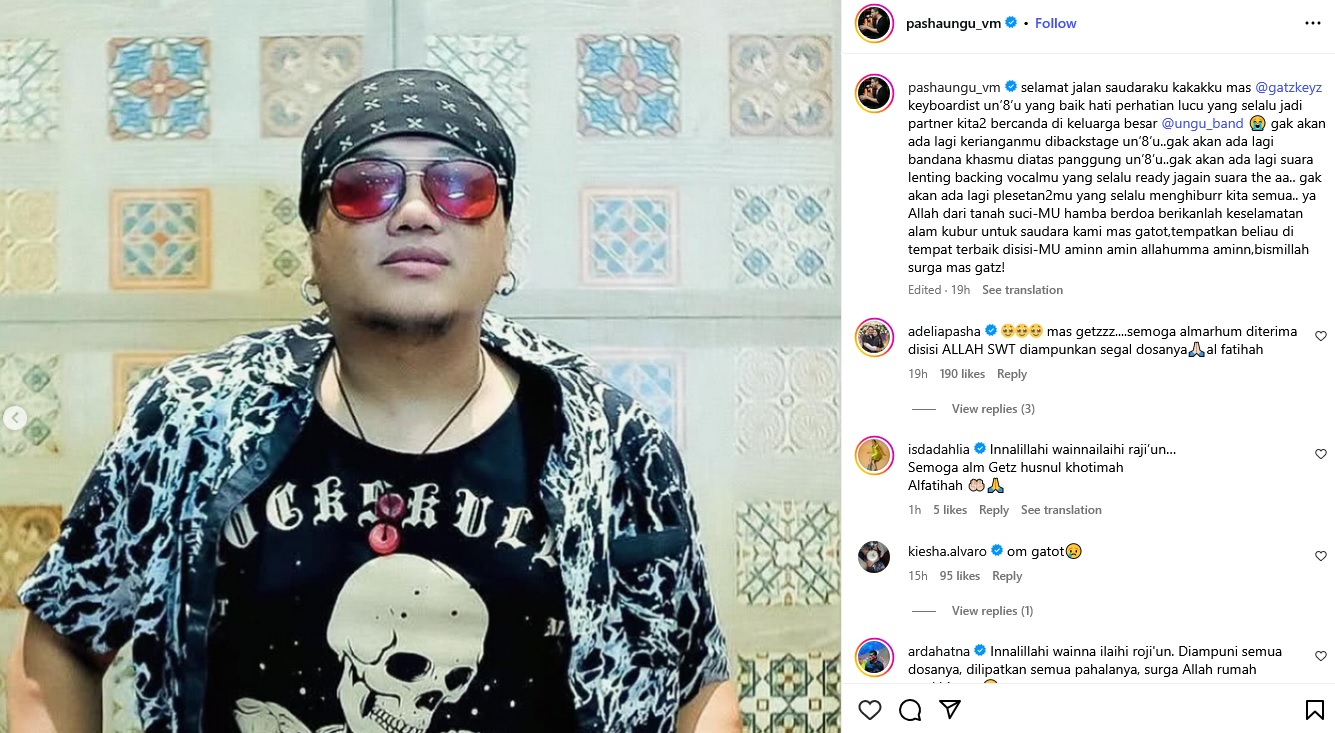 “selamat jalan saudaraku, kakakku, mas gatz… takkan ada lagi canda tawamu di balik panggung. takkan ada lagi bandana khasmu dan suara lembutmu yang menjaga harmoni kami. dari tanah suci, aku berdoa, semoga allah lapangkan jalanmu menuju surga,” tulis pasha dengan penuh haru, disertai emoji menangis.