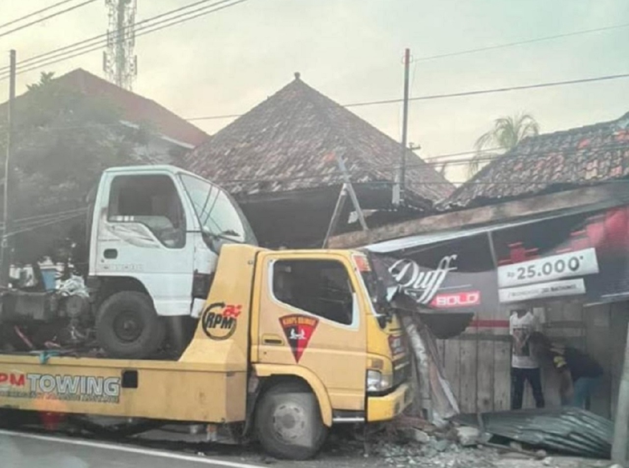 Truk berwarna krem dengan gambar logo Brigande Mobil (Brimo) di pintunya itu menabrak sebuah tiang listrik dan pagar sebuah warung milik Susilawati (48) yang berada di lokasi kejadian.