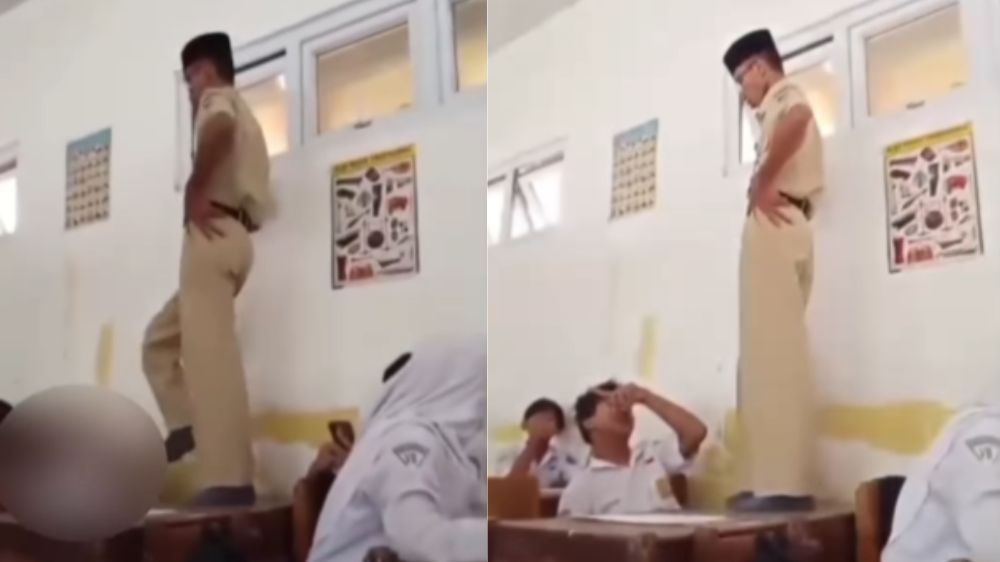 Dalam video tersebut, tampak guru berinisial WD (51) menaiki meja siswa sebelum kemudian menendang salah satu murid yang duduk dengan tenang sambil bermain ponsel.