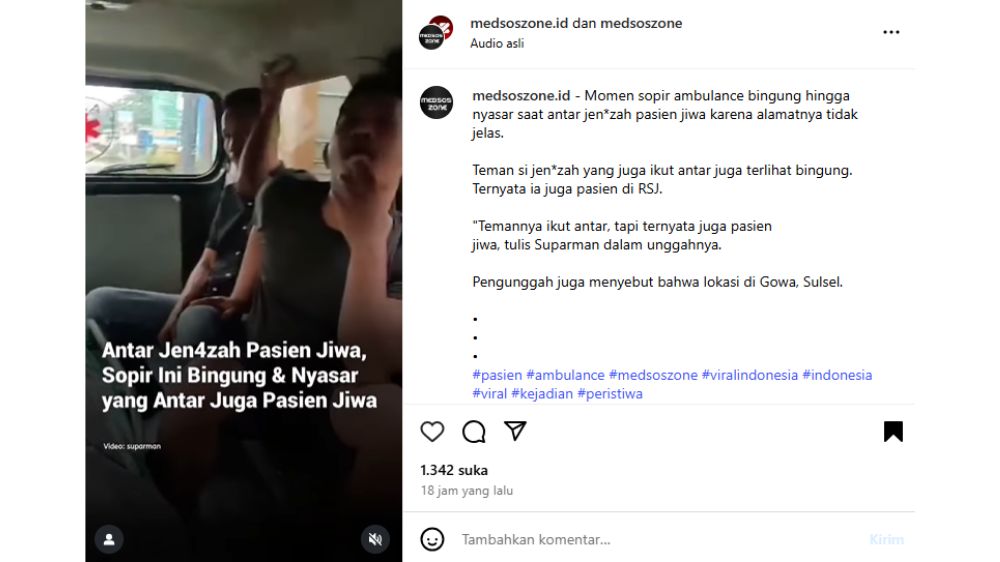 “Momen sopir ambulans bingung hingga nyasar saat antar jenazah pasien jiwa karena alamatnya tidak jelas,” tulis @medsoszone dalam keterangan unggahan.