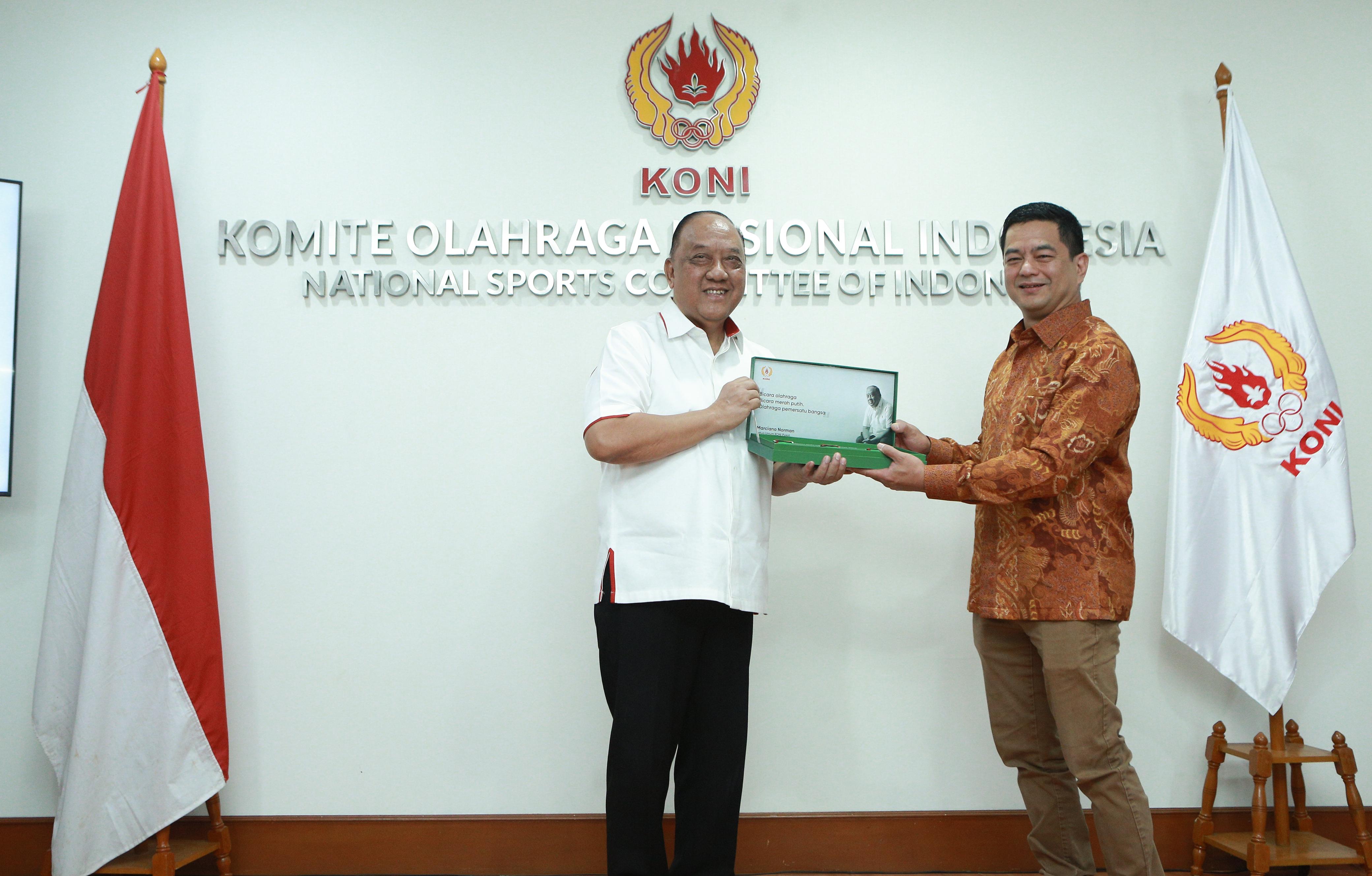 Ketua Umum KONI Pusat Letjen TNI (Purn) Marciano Norman (kiri) menyerahkan secara simbolis souvenir kepada Martin Basuki Hartono dari Djarum Foundation di sela acara Penandatanganan Perjanjian Kerja Sama PON Beladiri 2025 di Gedung KONI Pusat, Selasa (17/-bacakoran.co -