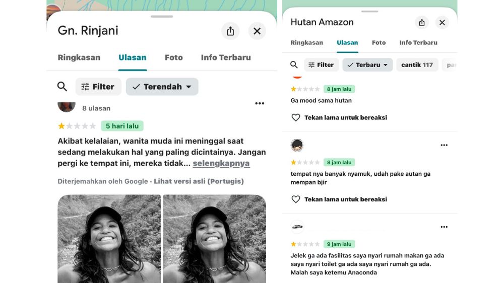 BACAKORAN.CO - Gunung Rinjani diserbu rating 1 di Google Maps usai insiden tragis. Netizen Indonesia balas rating Hutan Amazon, bikin geger jagat maya!