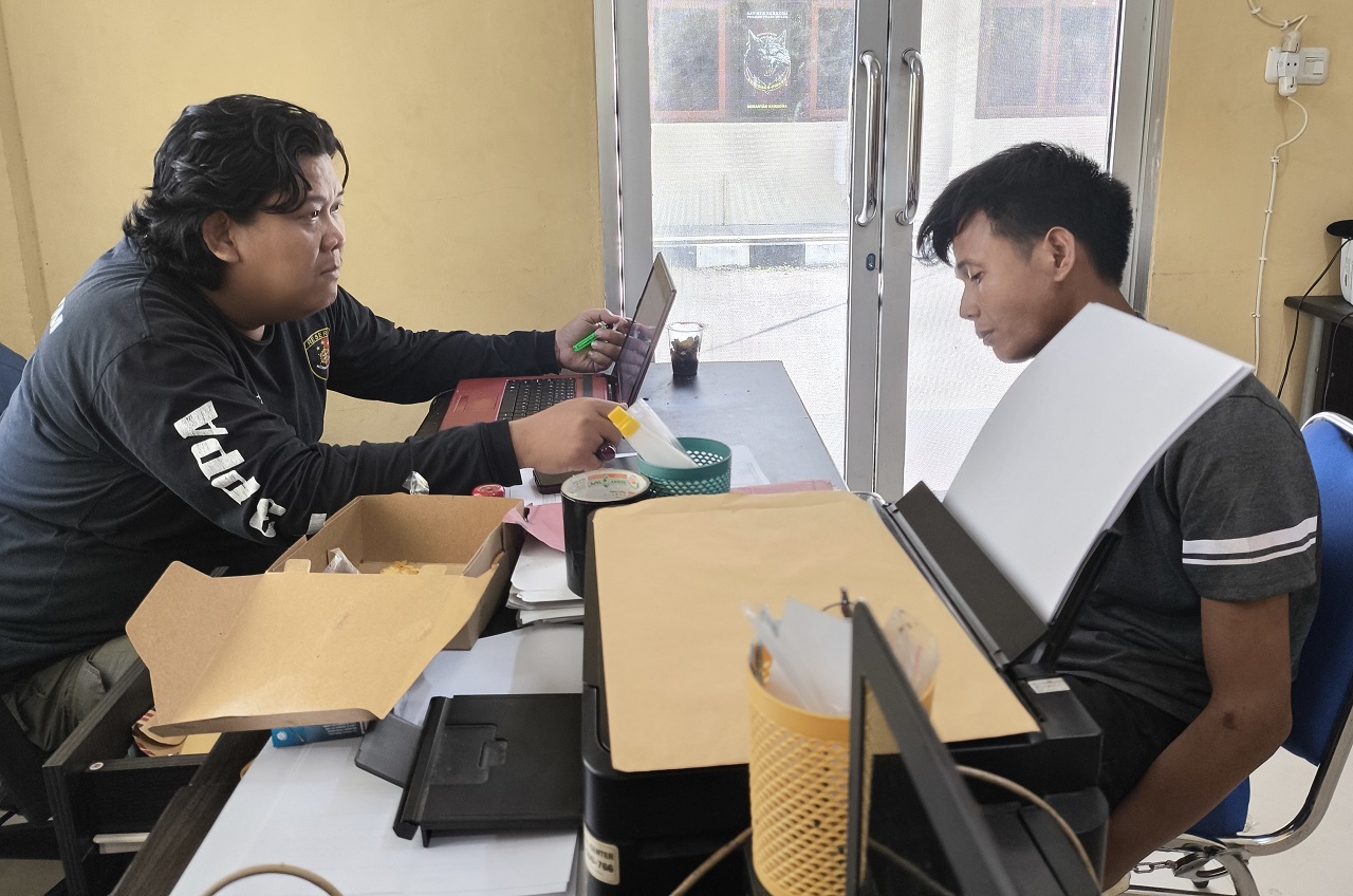 Tersangka Sandra Saputra saat dimintai keterangan oleh penyidik Polres Prabumulih. (foto :dian/sumeks)--
