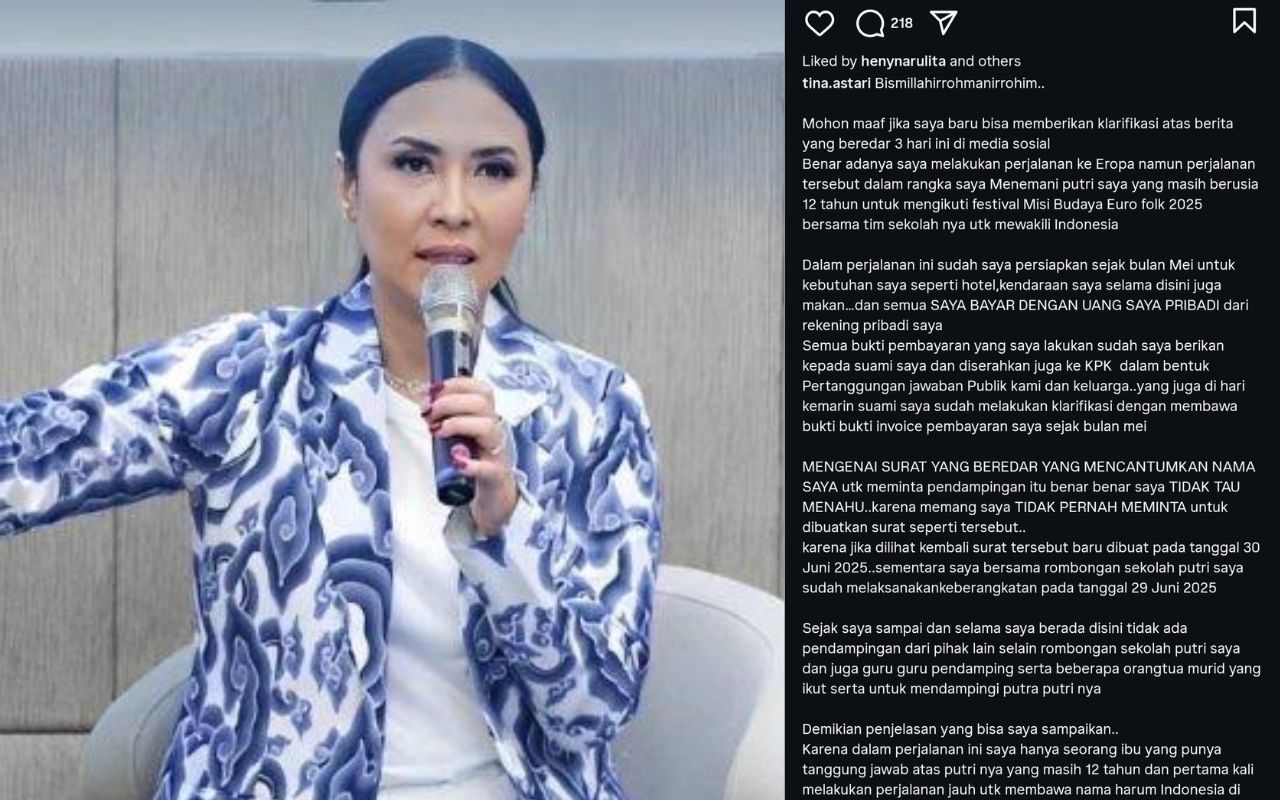 "Benar adanya saya melakukan perjalanan ke Eropa namun perjalanan tersebut dalam rangka saya menemani putri saya yang masih berusia 12 tahun untuk mengikuti festival Misi Budaya Euro folk 2025 bersama tim sekolah nya utk mewakili Indonesia," kata Tina sebagaimana dikutip Bacakoran.co dari akun Instagramnya tina.astari's, Senin (7/7/2025).