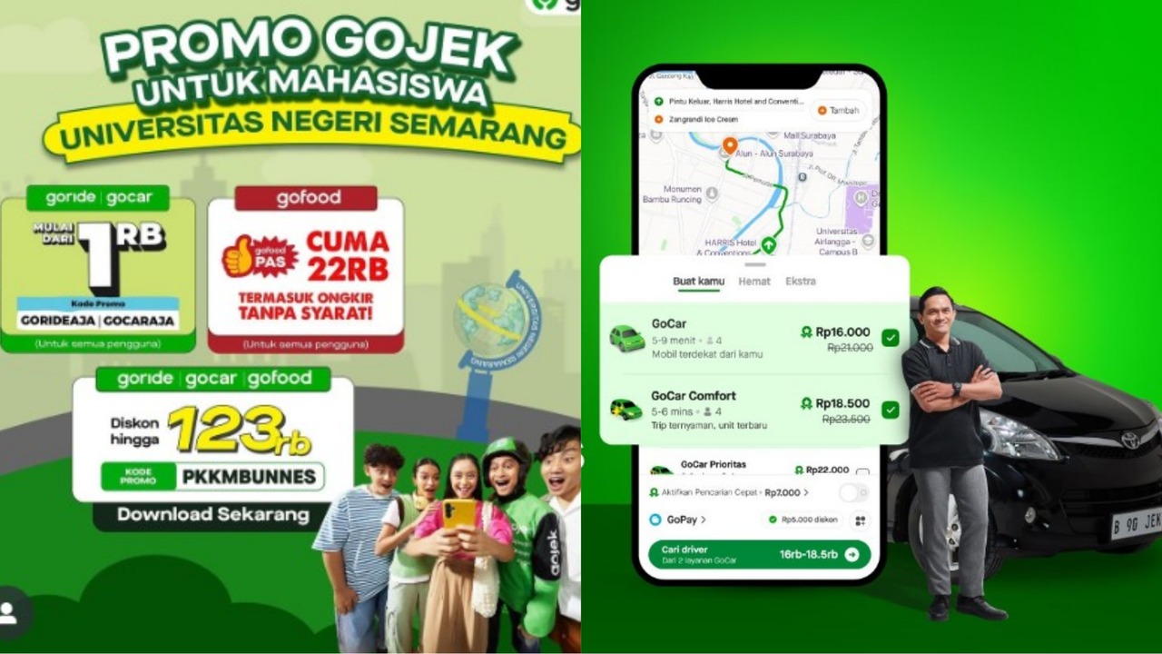 booking gocar irit 20% hingga rp 300.000 pakai kode promosi gojek bandara jakarta, bali dan surabaya 20% hingga rp 40.000 berakhir 31/12/2025.
