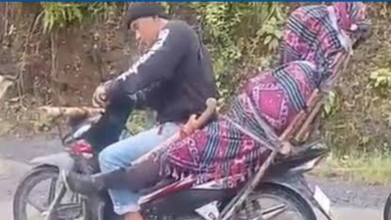 Dengan kondisi jalan rusak yang tak ramah kendaraan roda empat, pria dalam video tersebut hanya bermodal sarung untuk menyanggah tubuh jenazah demi memastikan agar jasad tak terjatuh selama perjalanan menuju rumah duka.