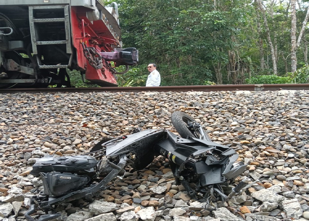 Sebuah sepeda motor yang ditunggangi dua orang pria tertabrak dan terseret kereta api penumpang Bukit Serelo, tujuan Lubuklinggau - Kertapati, Palembang  hingga ratusan meter
