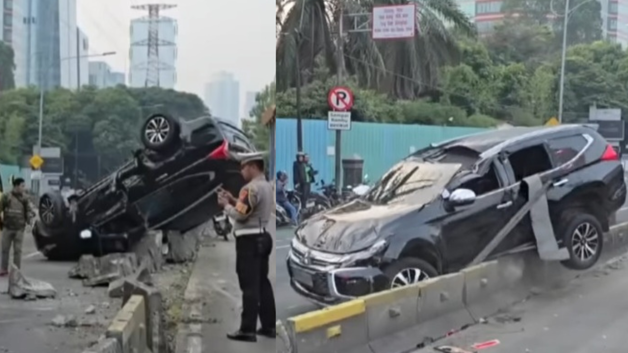Kecelakaan mobil Pajero di Gatot Subroto Jakarta menyebabkan dua pemotor terluka setelah kendaraan menabrak separator beton dan terguling. --Youtube-KOMPASTV