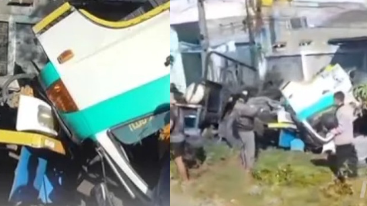 Kecelakaan bus di Sidoarjo yang menabrak truk hingga terguling, Benturan keras menyebabkan truk terguling dan kabinnya terlepas, mengakibatkan sopir truk mengalami luka serius. --Youtube-METRO TV