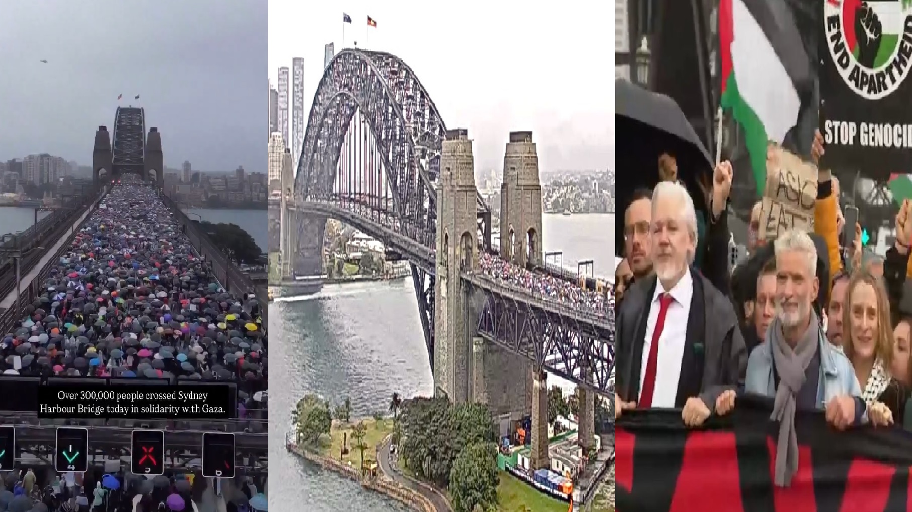 Aksi kemanusiaan terbesar di Australia untuk dukung Palestina, sebanyak 90 ribu orang ‘menguasai’ Jembatan Pelabuhan Sydney dan diikuti sejumlah tokoh ternama. --kolase @alanRMacledo dan @Partisan_12