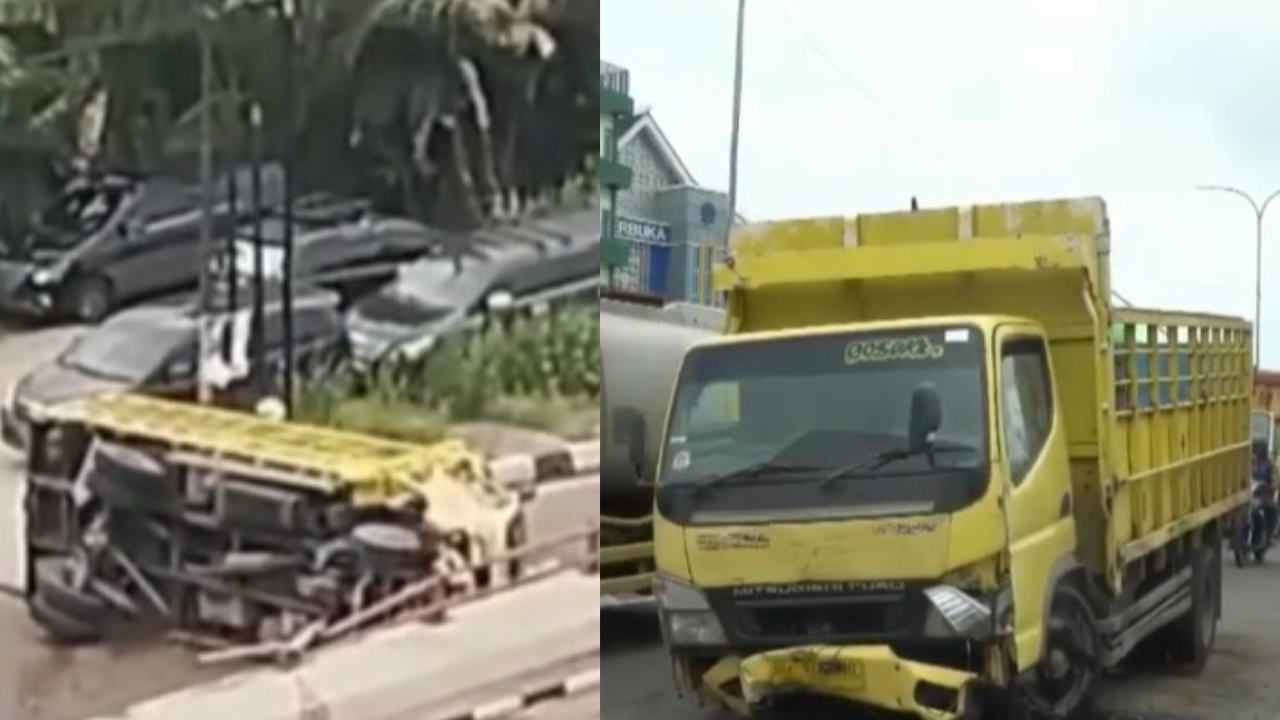 Sebuah truk tanpa muatan dengan nomor polisi BG 8228 MC menghantam pembatas jalan hingga menyebabkan kerusakan parah pada kendaraan dan infrastruktur sekitar.