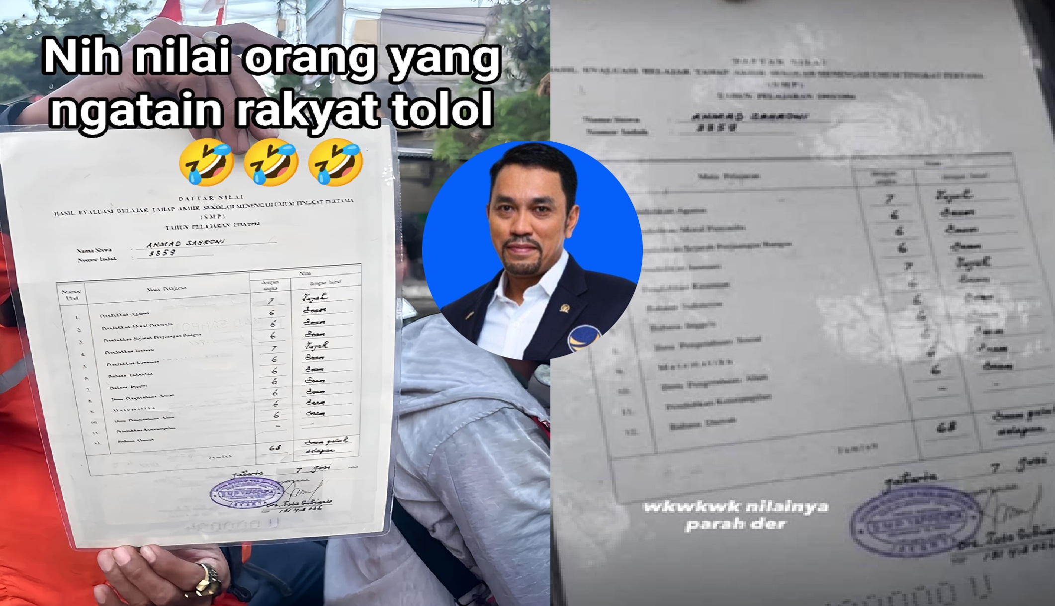 Massa menemukan ijazah SMP Ahmad Sahroni saat melakukan penjarahan ke rumahnya. Ijazah Ahmad Sahroni itu memiliki nilai rata-rata enam.--kolase @mukhtar aljawi dan @yoga saputro / facebook