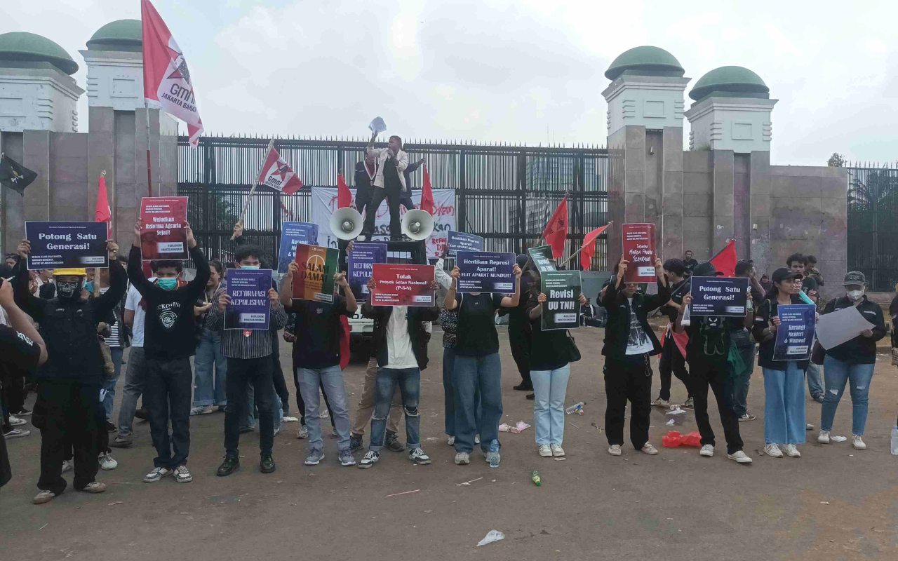 BACAKORAN.CO – Dozens of university students from various organizations, along with several community groups, held a protest in front of the Indonesian House of Representatives (DPR/MPR RI) building in Senayan, Jakarta, on Monday, September 1, 2025.