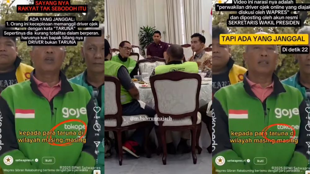 Asosiasi ojol klarifikasi pertemuan dengan Gibran bukan wakil resmi. Netizen lebih dulu bongkar kejanggalan lewat video/Kolase Bacakoran.co--Instagram @bushcoo dan X @Doni***