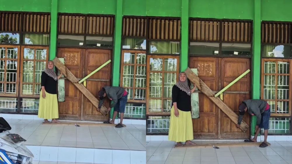 Dalam rekaman yang beredar, terlihat perempuan tersebut memasang papan kayu besar pada pintu masuk kantor camat.