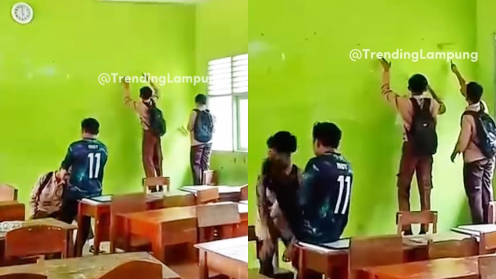 dalam video yang diunggah ulang oleh akun instagram @trendinglampung, terlihat suasana kelas dengan sejumlah siswa laki-laki berada di sisi kiri ruangan.