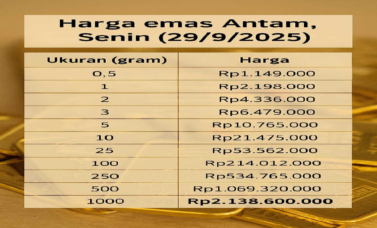 Berikut update harga emas Antam hari ini, Senin (29/9/2025):