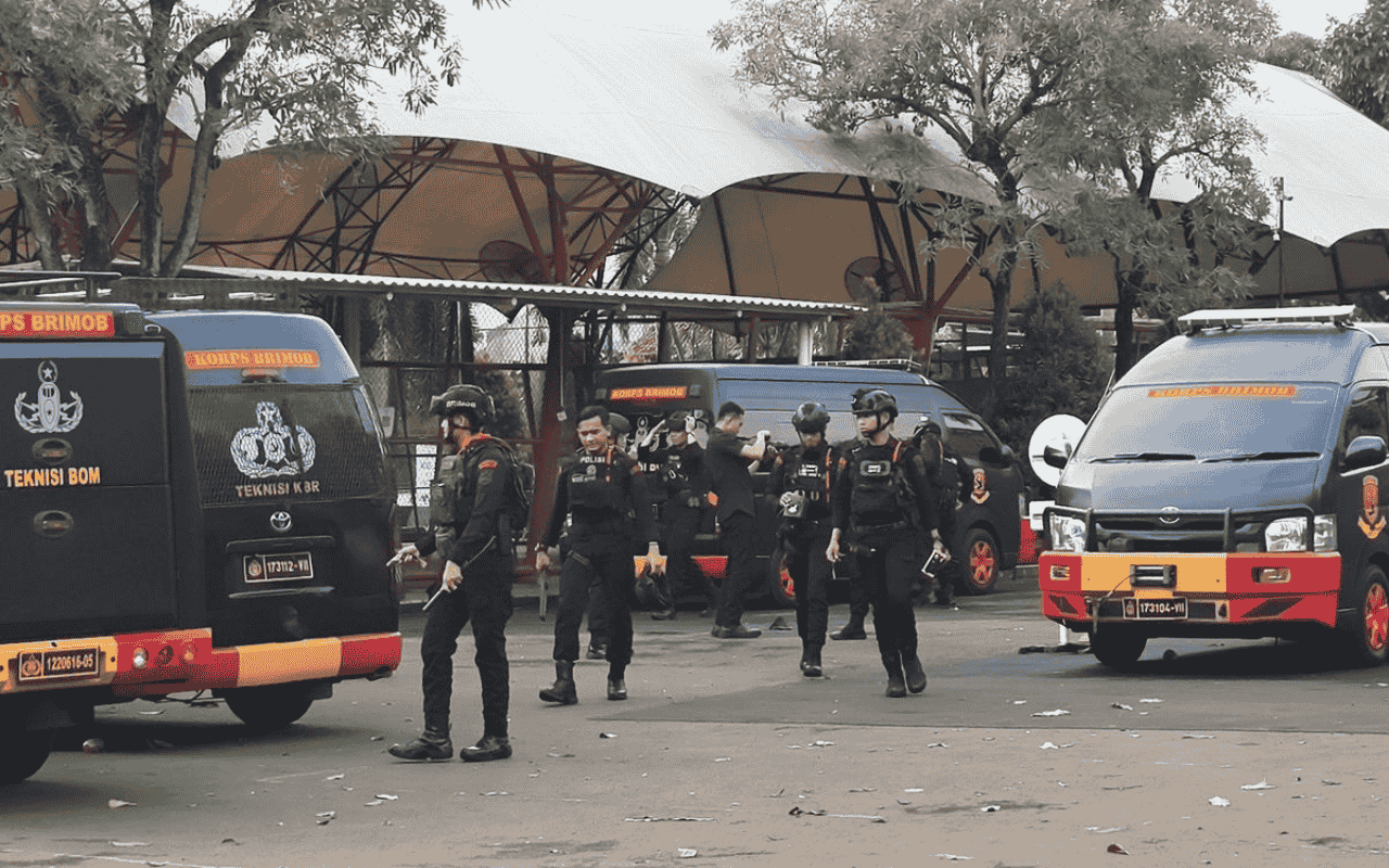 tim jibom detasemen satbrimob polda metro jaya diterjunkan ke lokasi untuk melakukan penyisiran dan memastikan keamanan sekolah.