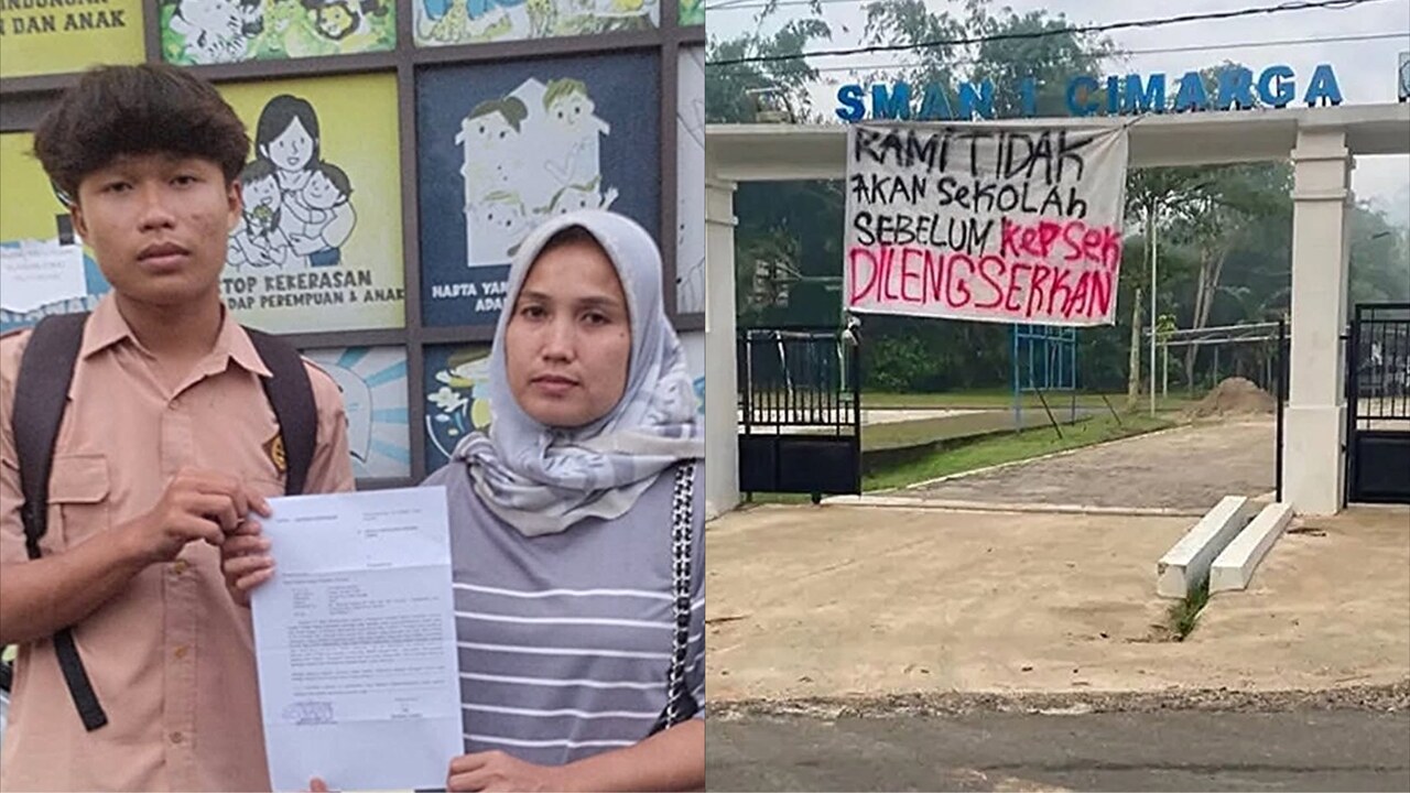 Mogok sekolah SMAN 1 Cimarga pecah setelah kepsek tampar siswa merokok. --Kolase X/@Meta80ki