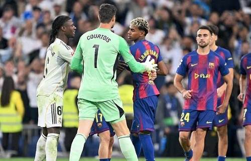 Beberapa pemain kemudian ikut campur, dengan Thibaut Courtois mendorong Yamal menjauh dan mengacungkan jarinya ke arahnya.