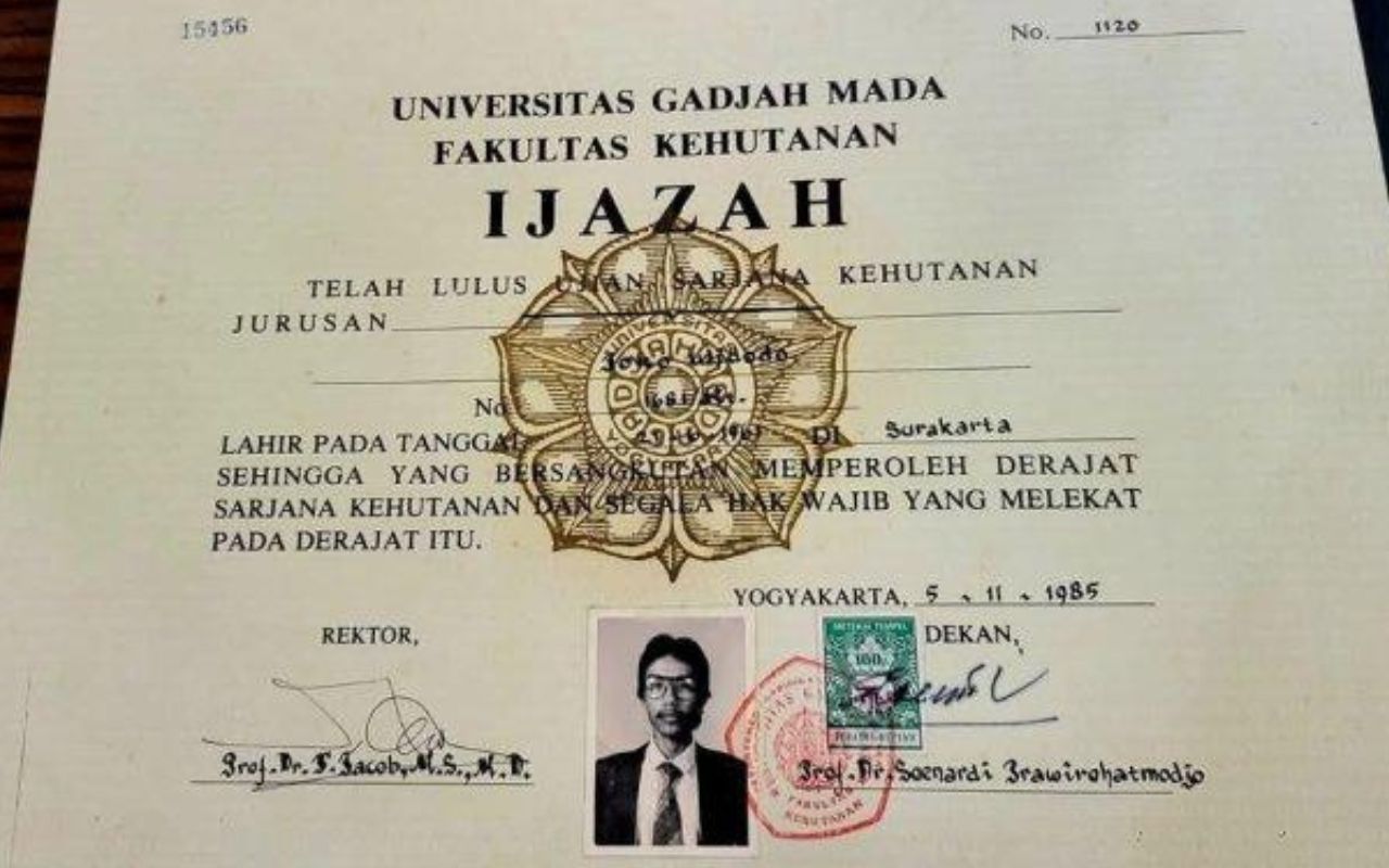 "penyelidik mendapatkan dokumen asli ijazah sarjana kehutanan nomor 1120 atas nama joko widodo dengan nim 1681kt fakultas kehutanan ugm pada tanggal 5 november 1985 yang telah diuji secara laboratoris,” ujar djuhandani, dalam konferensi pers, kamis (22/5/2025).