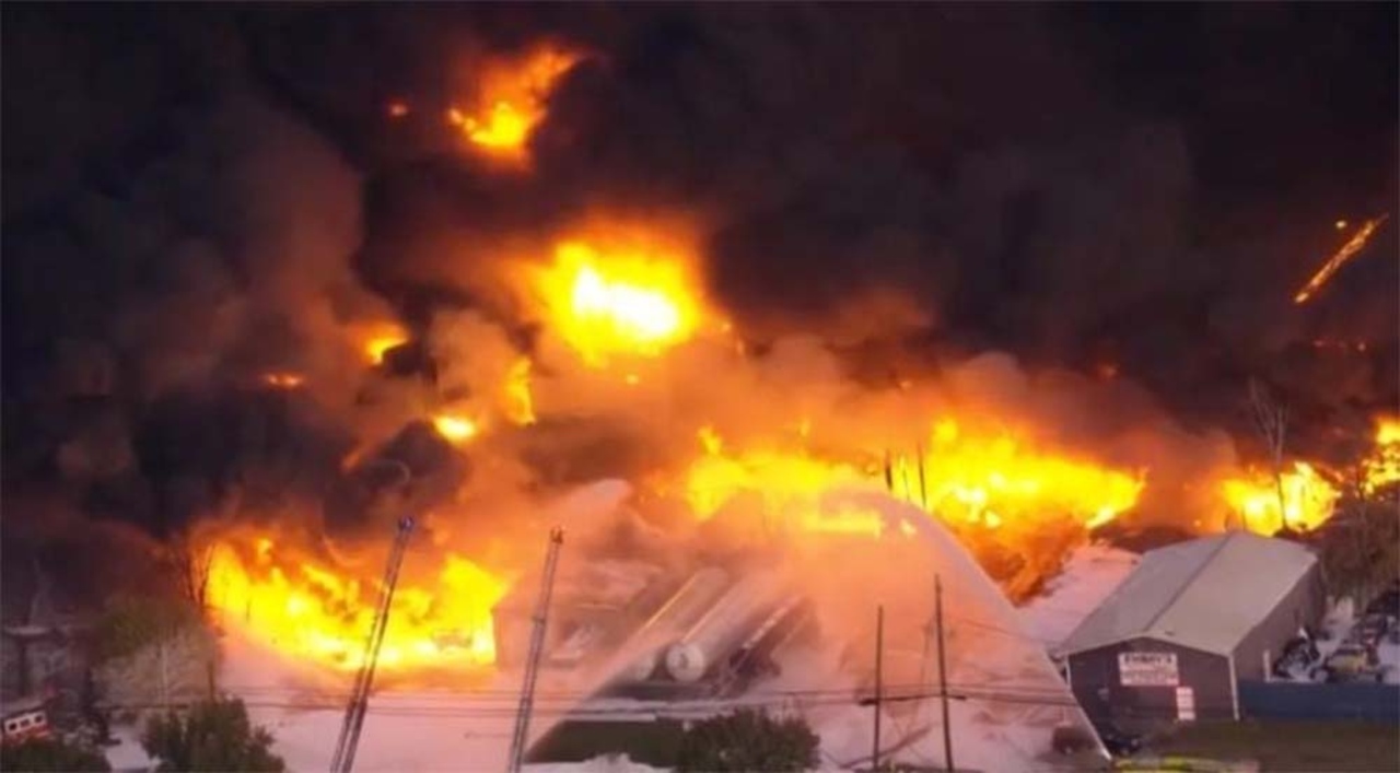 video dan foto yang beredar menunjukkan ledakan besar di lokasi dampak terbakar kobaran api disertai asap hitam tebal yang membumbung tinggi.