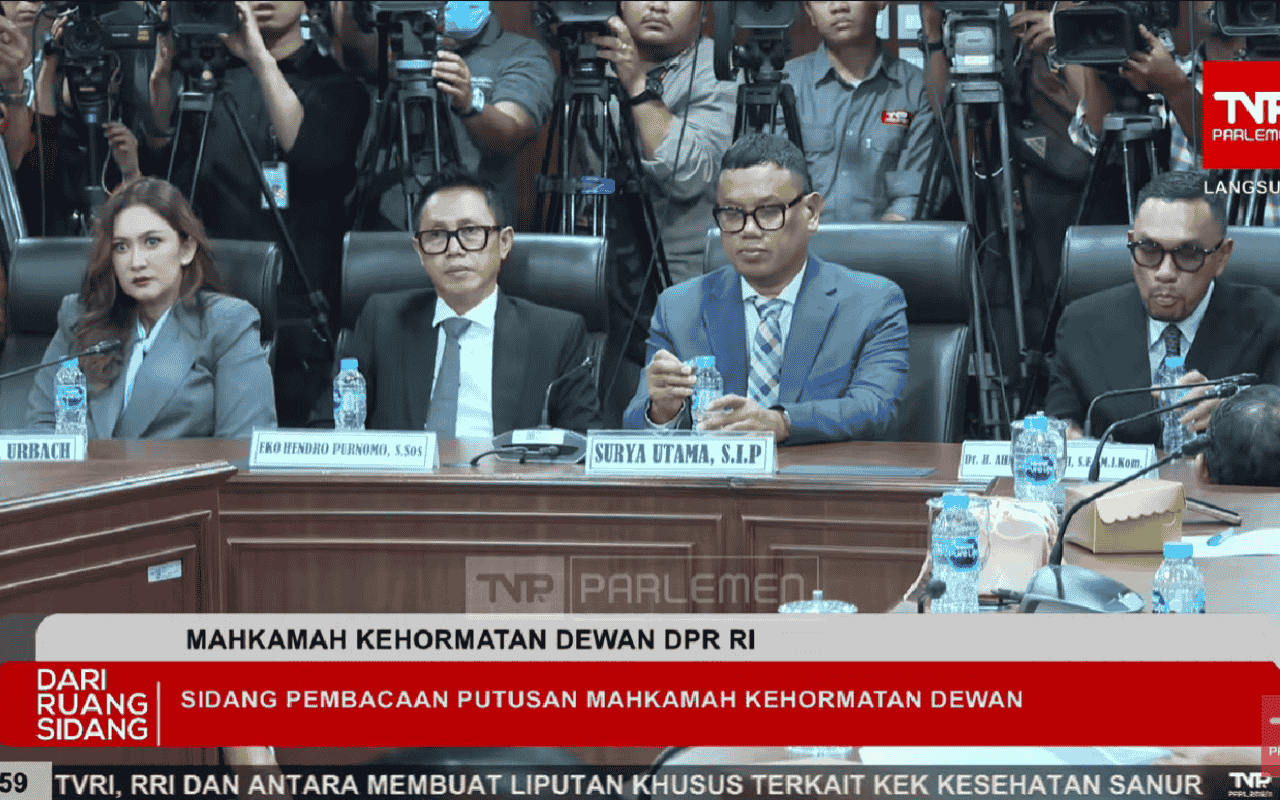 “Menyatakan teradu tiga, Surya Utama, tidak terbukti melanggar kode etik. Menyatakan teradu tiga Surya Utama diaktifkan sebagai anggota DPR RI terhitung sejak keputusan ini dibacakan,” ujar Wakil Ketua MKD DPR Adang Daradjatun, dikutip dari CNN Indonesia.