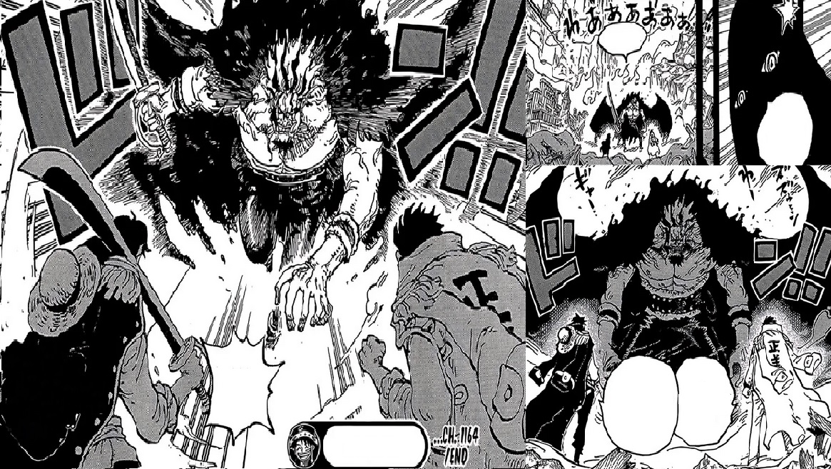 Akibatnya, Rocks berubah menjadi monster iblis tak terkendali, dipenuhi aura kegelapan dan Conqueror’s Haki yang begitu brutal hingga langit God Valley bergetar.