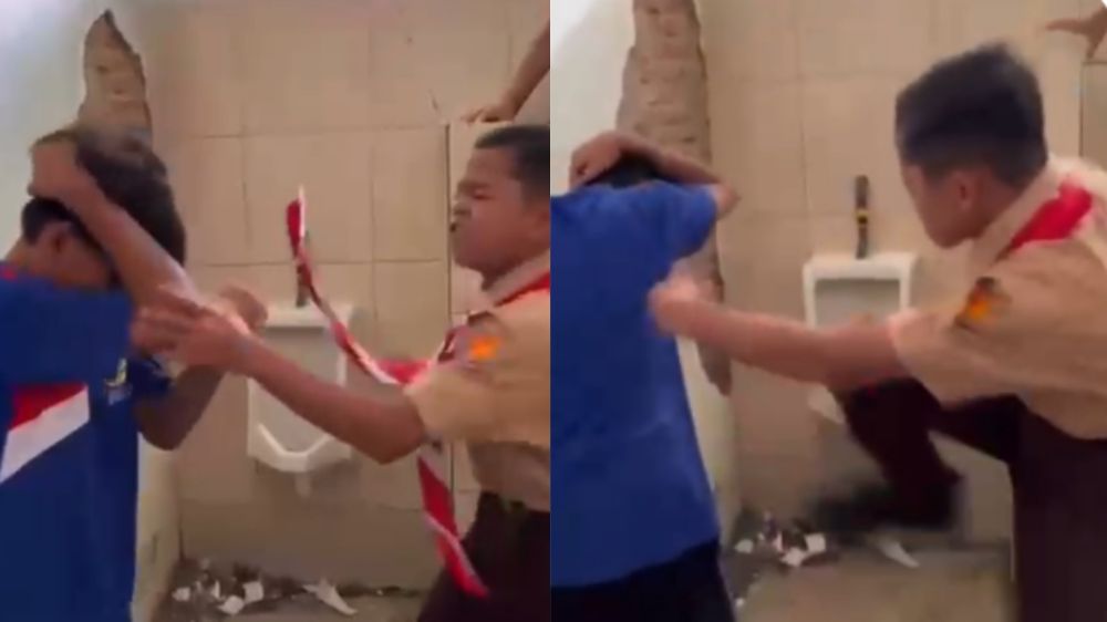 Beberapa siswa lain yang mengenakan seragam pramuka tampak berkerumun, menyaksikan insiden tersebut tanpa berusaha melerai.