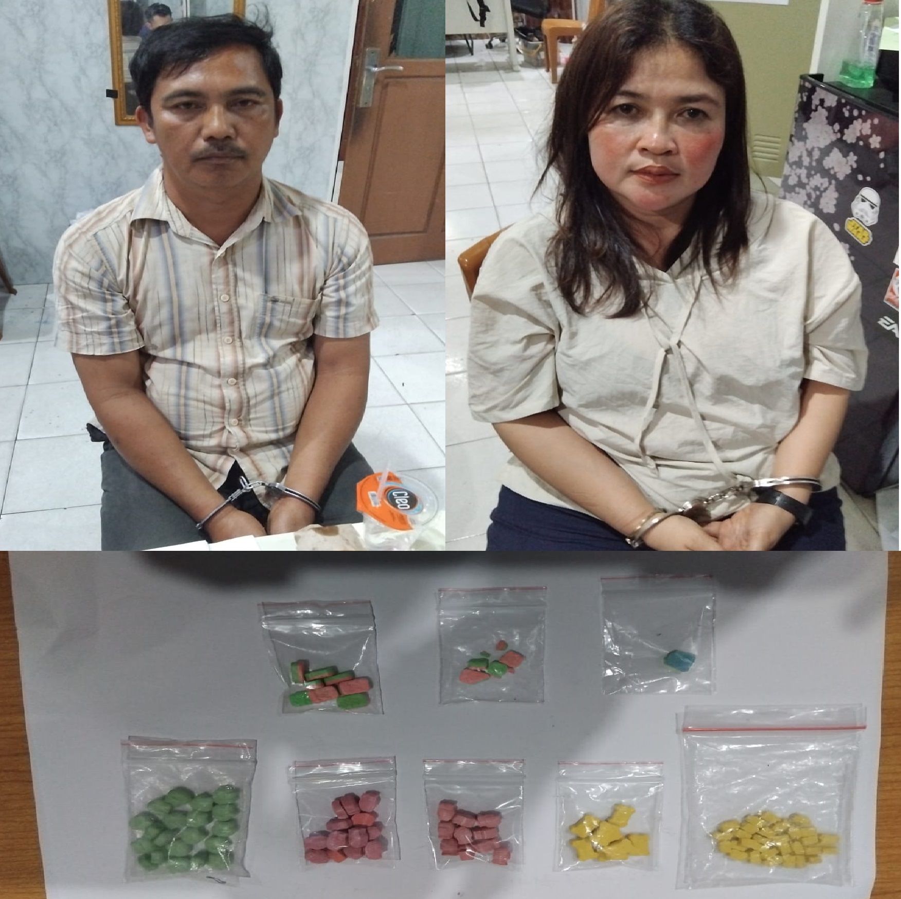 Hendrik alias Krek (49) beserta istrinya RA Karnati alias Atik (44) beserta barang bukti yang diduga narkoba berbentuk pil ektasi saat diamankan petugas. (foto :abdulkholid/sumeks)--