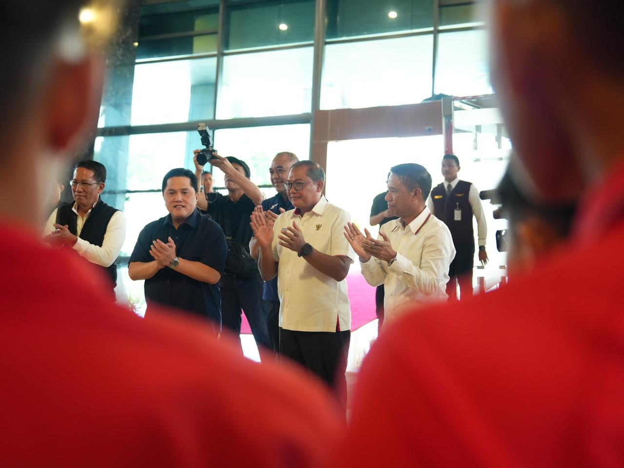 Erick Thohir didampingi anggota Exco Arya Sinulingga, Muhammad, lalu Ketua Badan Tim Nasional, Sumardji dan Sekjen Yunus Nusi. Hadir juga Menteri Hukum dan HAM RI Supratman Andi Agtas.