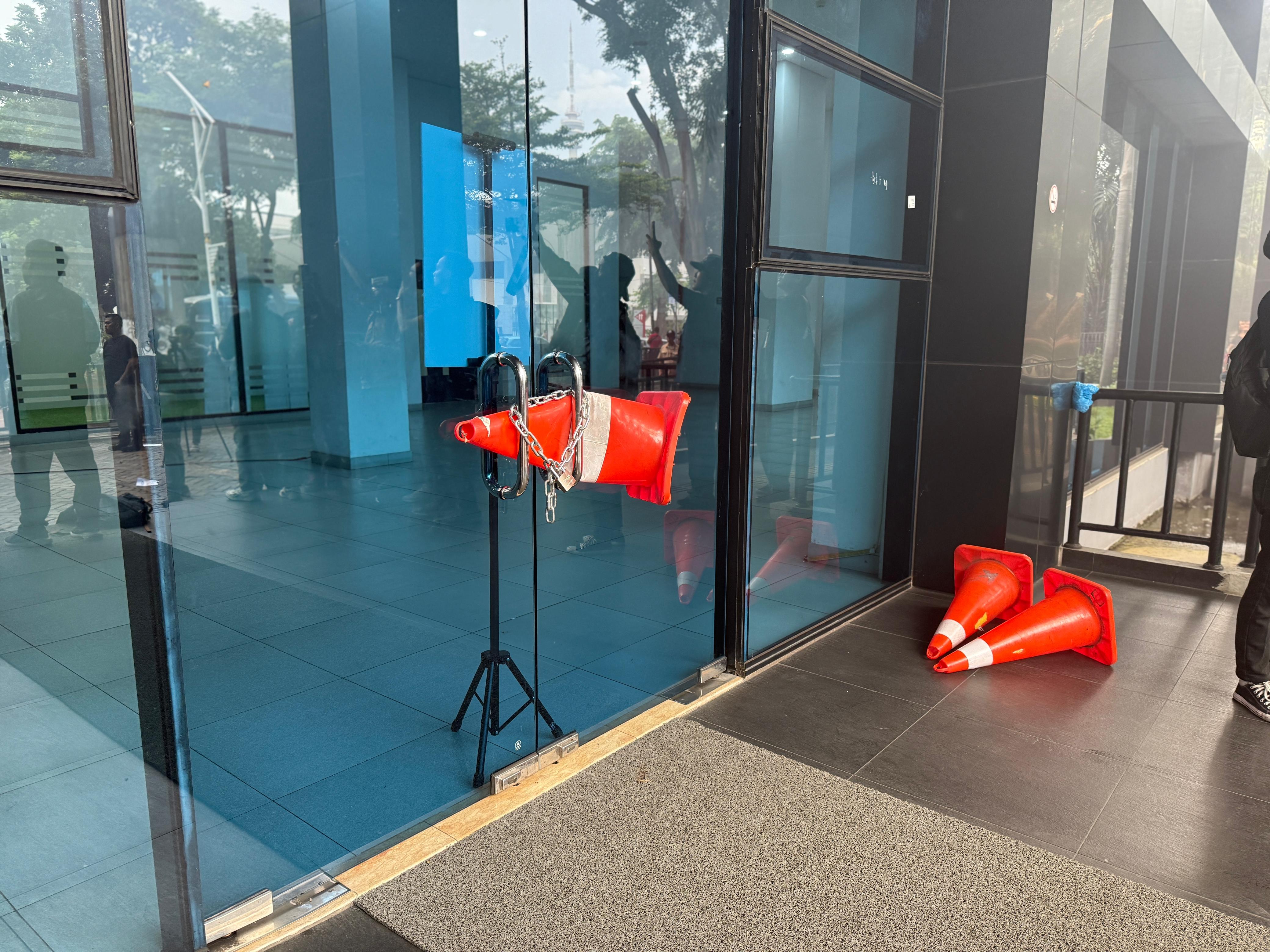 Dua pintu masuk dari pintu utama disegel dengan rantai. Kemudian pintu itu ditutup dengan cone juga pembatas jalan warna oranye.