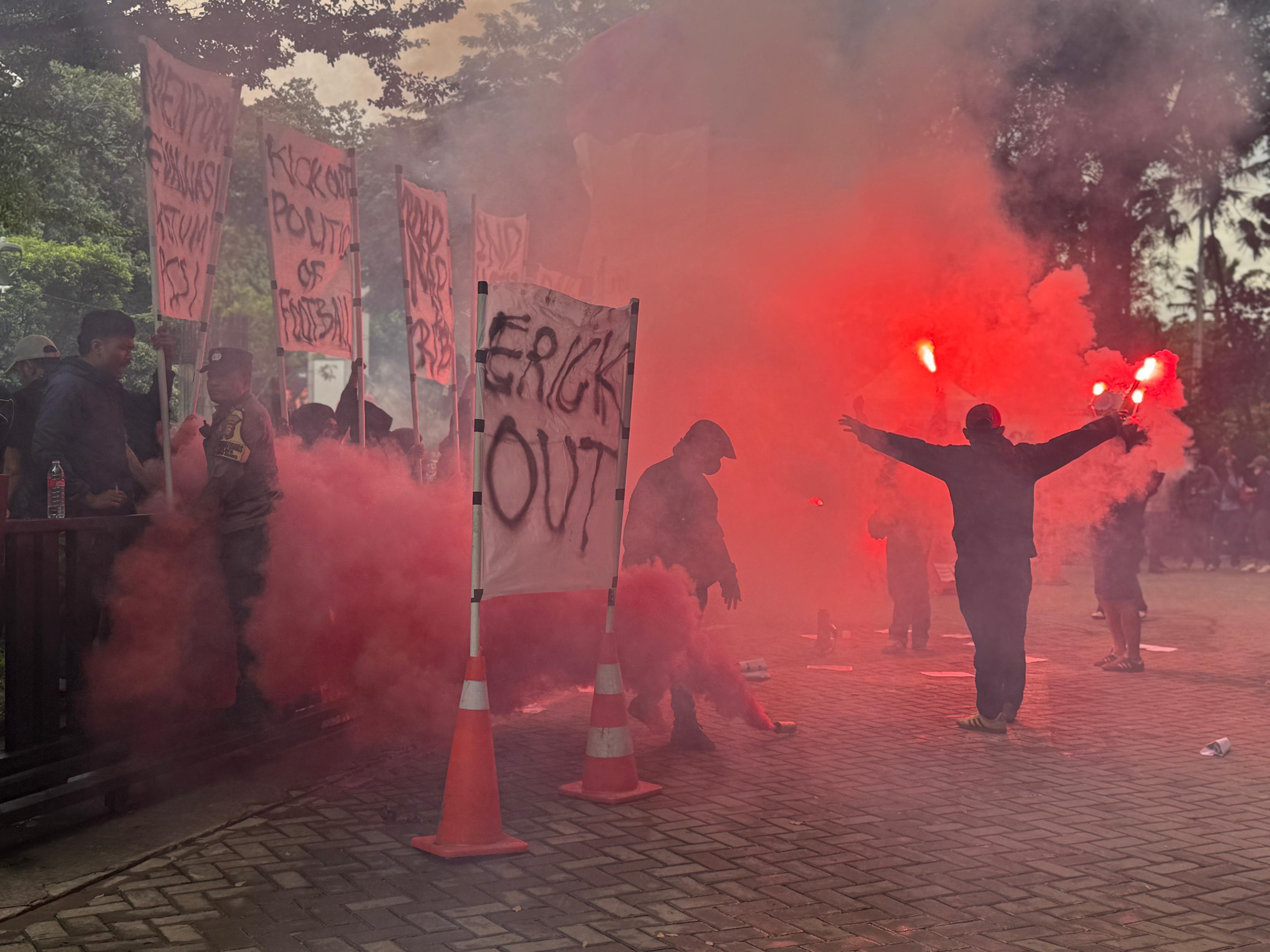 Tak sampai di situ, peserta aksi juga menyalakan flare. Mereka berjingkrak layaknya mendukung perjuangan aksi Timnas Indonesia di stadion.