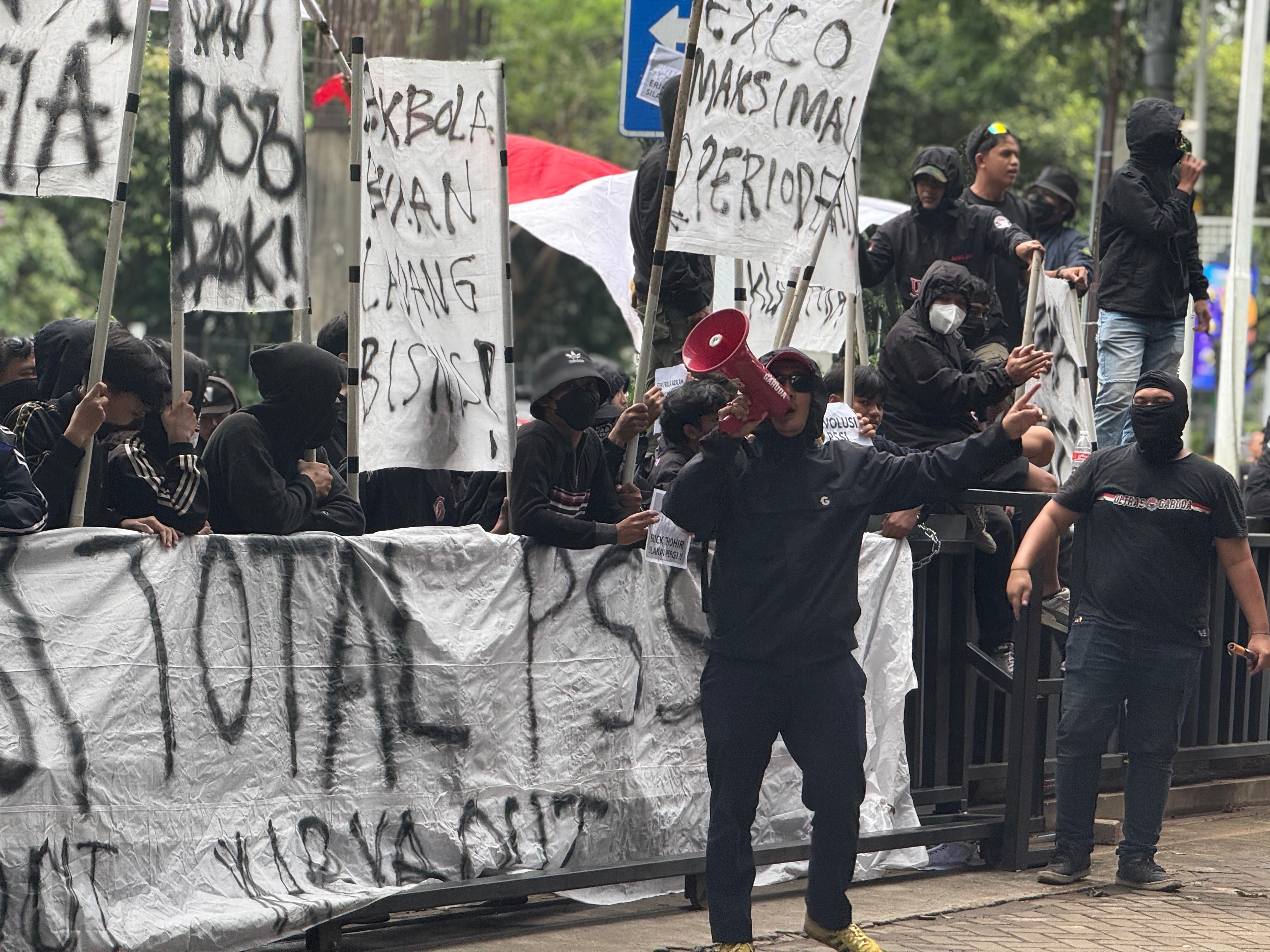 BACAKORAN.CO - Kantor PSSI yang ada di GBK Arena, Senayan, Jakarta Pusat, didemo suporter Jumat sore (14/11). Puluhan suporter Ultras Garuda yang identik dengan warna hitam itu menyuarakan aspirasinya di depan kantor.