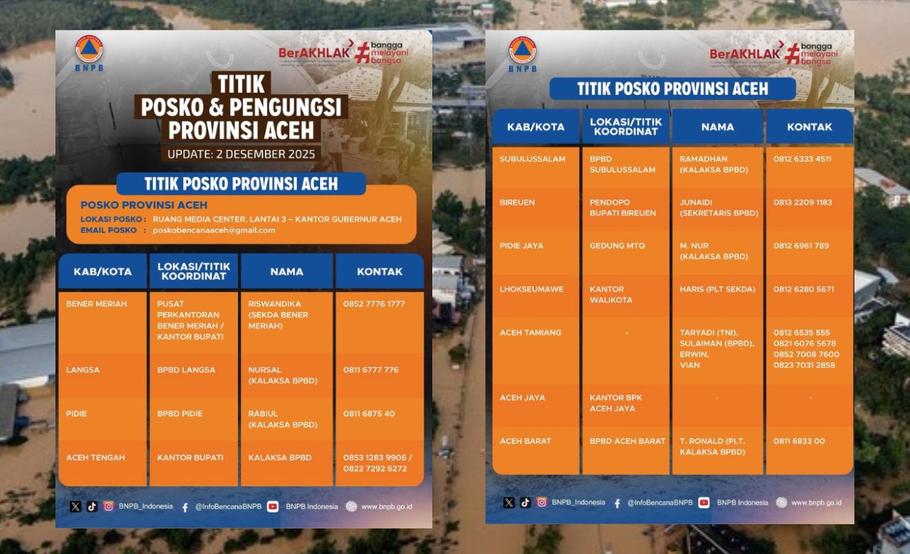 Berikut daftar titik posko aktif di wilayah Aceh lengkap dengan nama penanggung jawab dan nomor kontak darurat: