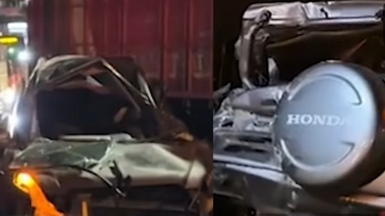 cr-v tampak mengalami kerusakan berat di hampir seluruh bagian bodi setelah terhimpit truk dan median jalan.