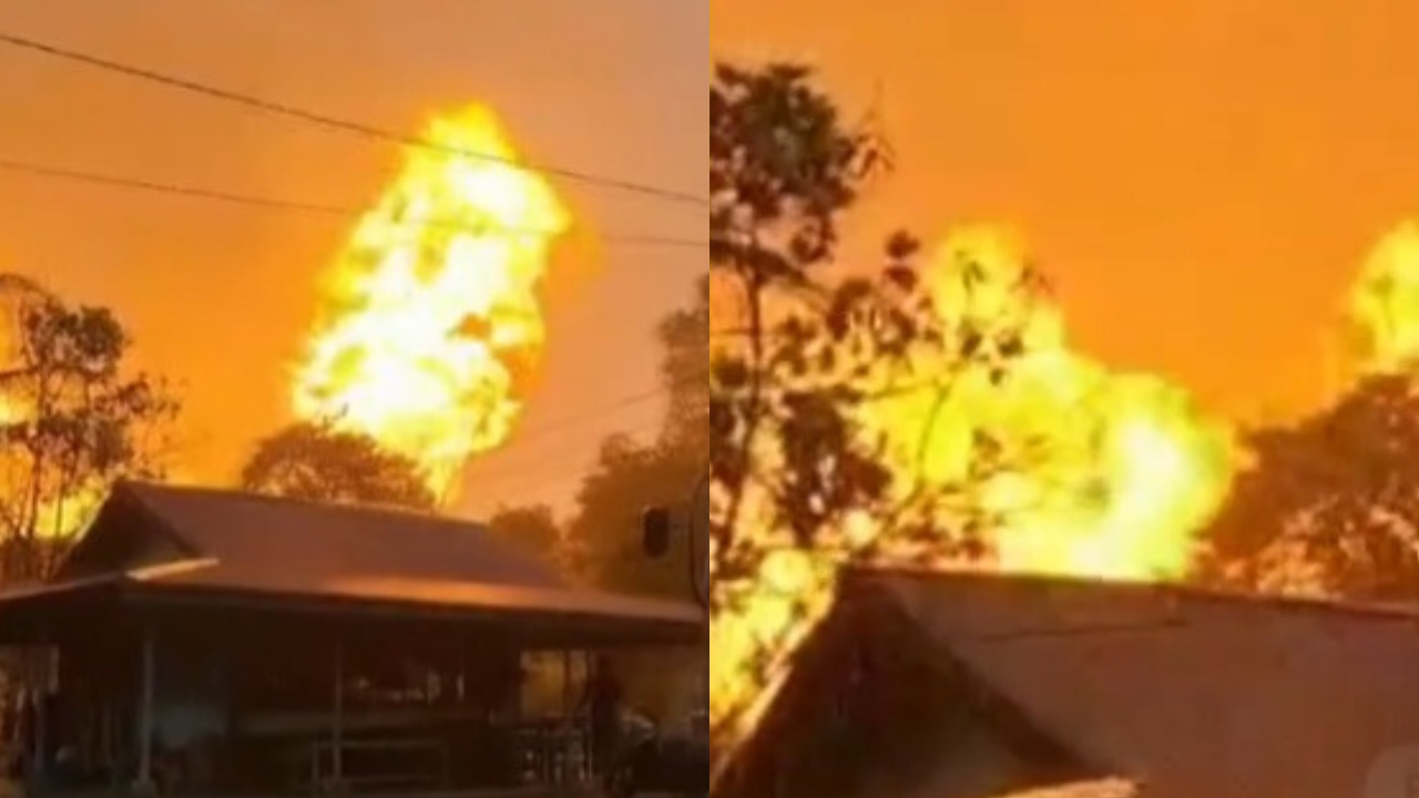 Api besar tampak menyala dari jalur pipa gas, dengan semburan api berwarna jingga disertai asap tebal hitam pekat.