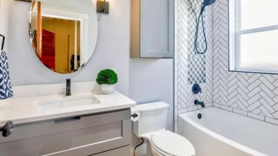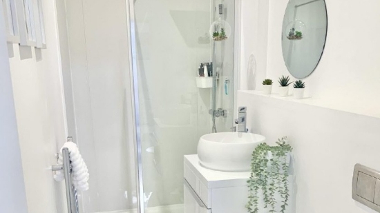 kamar mandi bernuansa putih akan terlihat rapi dan modern, apalagi jika dipadukan dengan sekat kaca transparan serta cermin bundar sederhana.