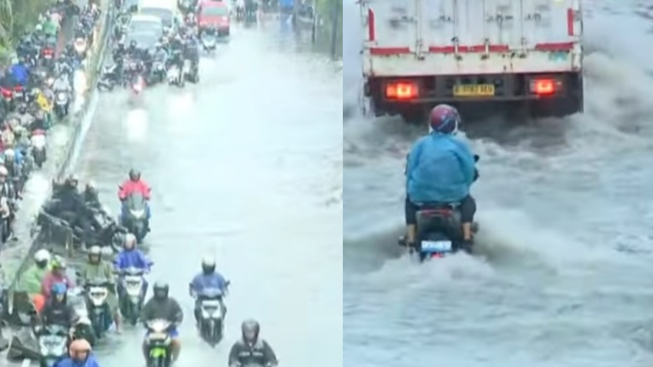 Melansir dari video youtube @kompastv, air menggenangi badan jalan dengan ketinggian bervariasi.