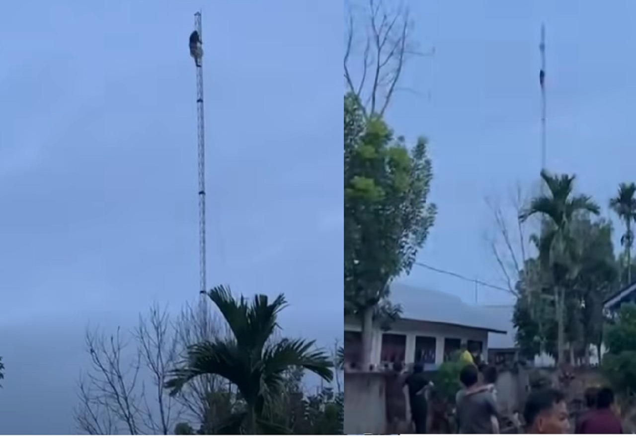 Pasalnya, seorang wanita yang masih berusia remaja terlihat memanjat tiang tower telekomunikasi yang ada di desa tersebut.