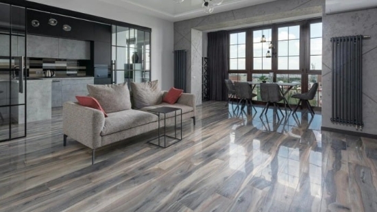 marmer, kayu, vinyl, hingga beton ekspos memberi sentuhan karakter unik, sementara palet warna netral, seperti abu-abu, krem, putih, dan hitam, menciptakan kesan lapang sekaligus bersih.