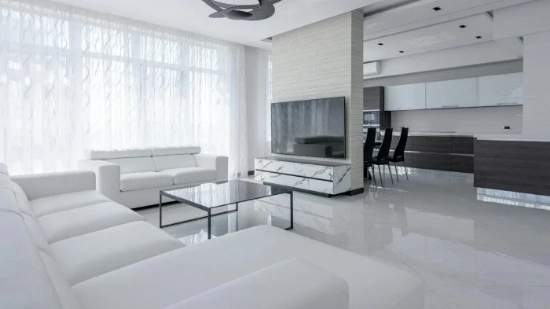 ruang tamu ini didominasi warna putih pada sofa, lantai marmer, dan langit-langit. putih menghadirkan kesan bersih, luas, dan elegan.