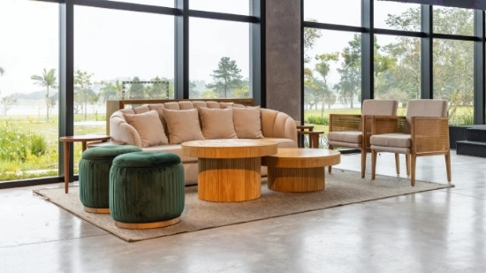 perpaduan furnitur bergaya minimalis dengan elemen kayu menciptakan harmoni yang seimbang.