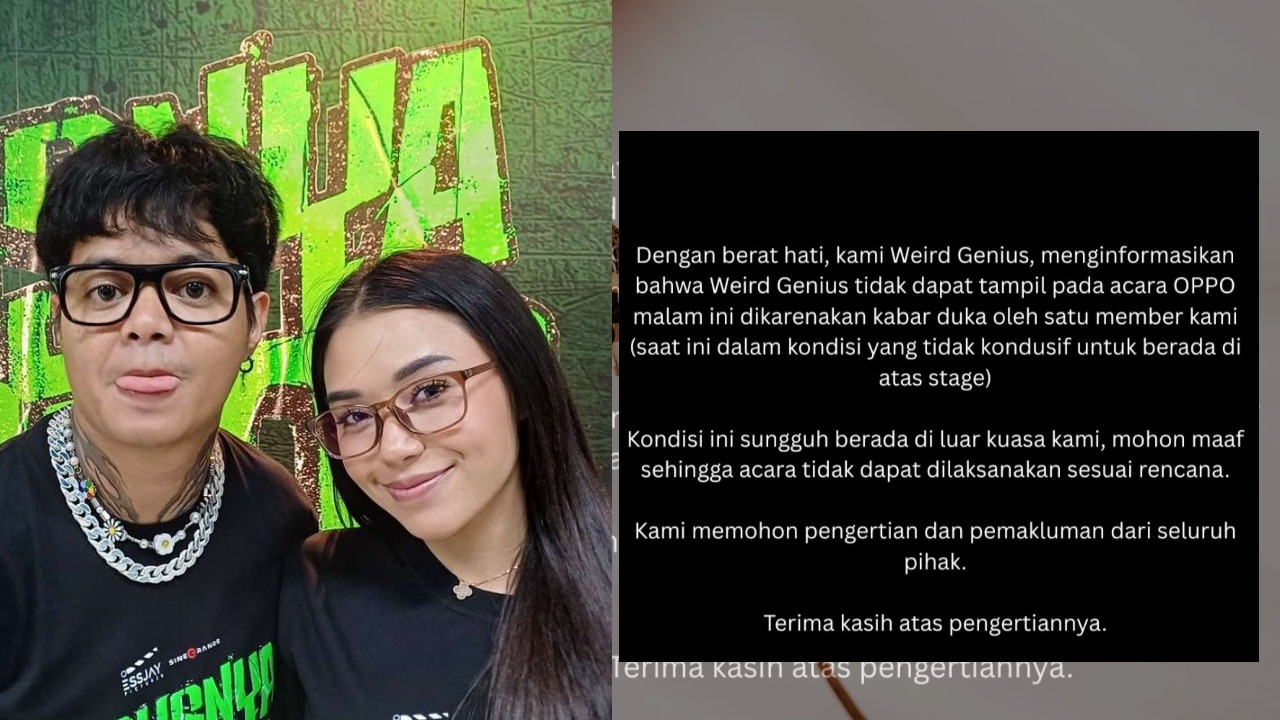 “Dengan berat hati, kami Weird Genius menginformasikan bahwa Weird Genius tidak dapat tampil pada acara OPPO malam ini dikarenakan kabar duka oleh satu member kami,” tulis pihak Weird Genius.