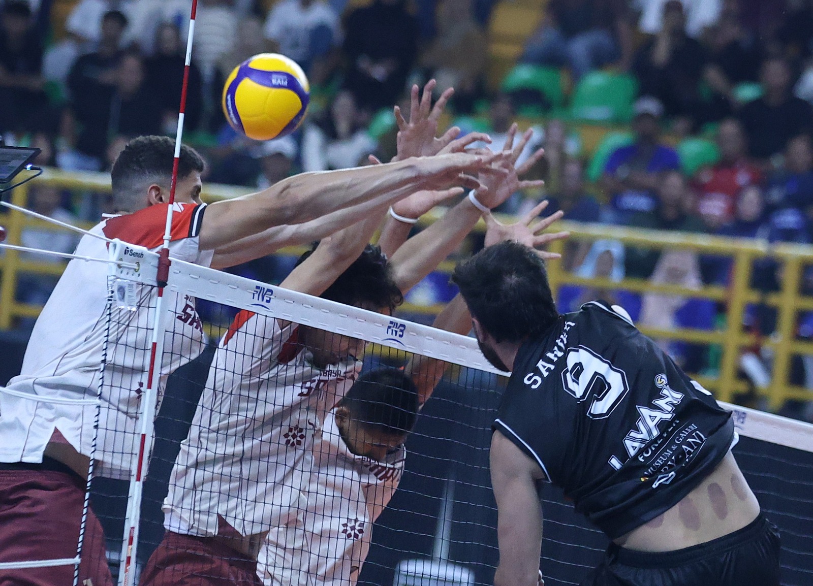 Smes pemain andalan Jakarta LavAni tak terbendung meski sudah diblok tiga pemain Surabaya Samator.-PBVSI-